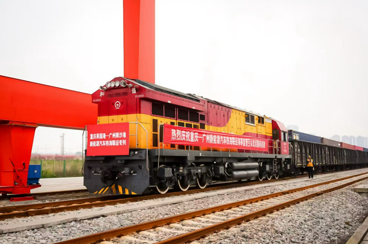 这是2026年首趟铁海联运“重庆造”新能源汽车专列,经48小时疾驰抵达广州南沙港后,将换装海轮运往中东市场。